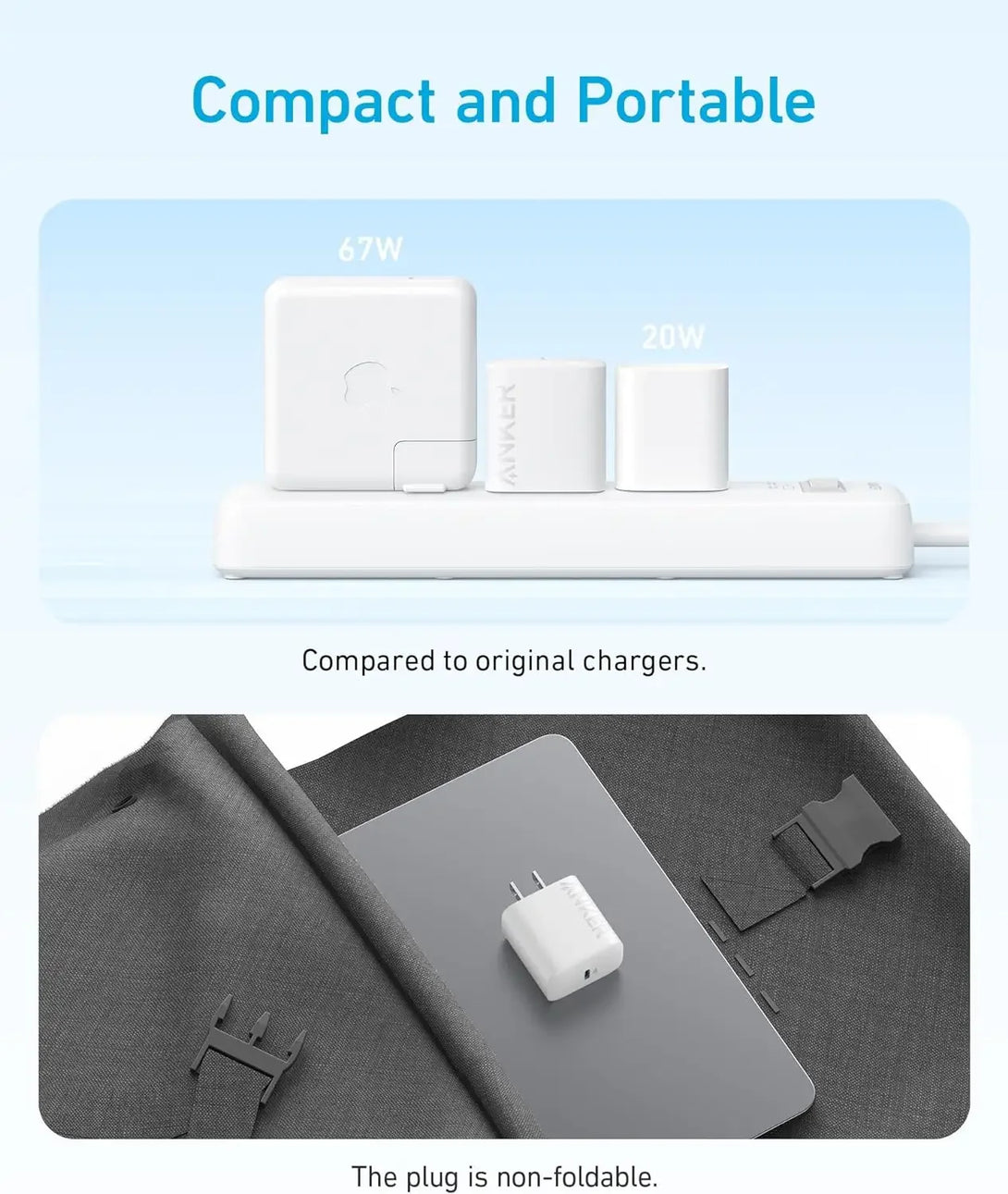 - محمولة وتوفر المساحة :يوفر التصميم الأنيق للشاحن مساحة قيمة، مما يسمح لك بشحن أجهزتك بكفاءة دون إرباك مساحة عملك أو حقيبة السفر.