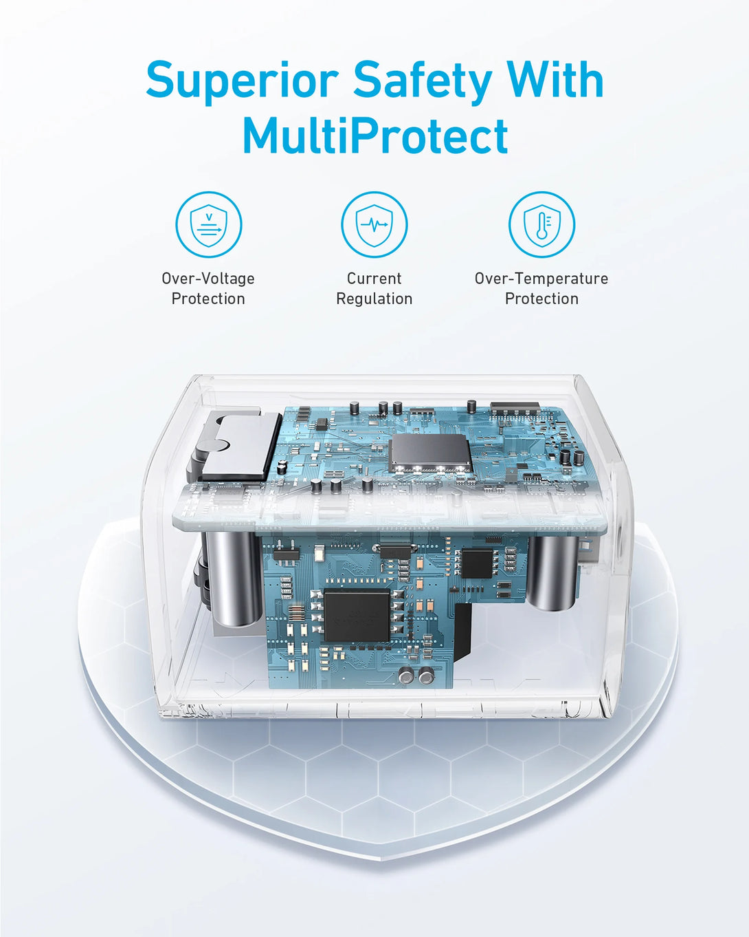 - أعلى مستوى من الحماية من خلال نظام MultiProtect: يجمع نظام Ankers MultiProtect بين حماية التيار الزائد وتنظيمه وميزات الأمان المتقدمة الأخرى حتى تتمكن من شحن أجهزتك دون قلق.