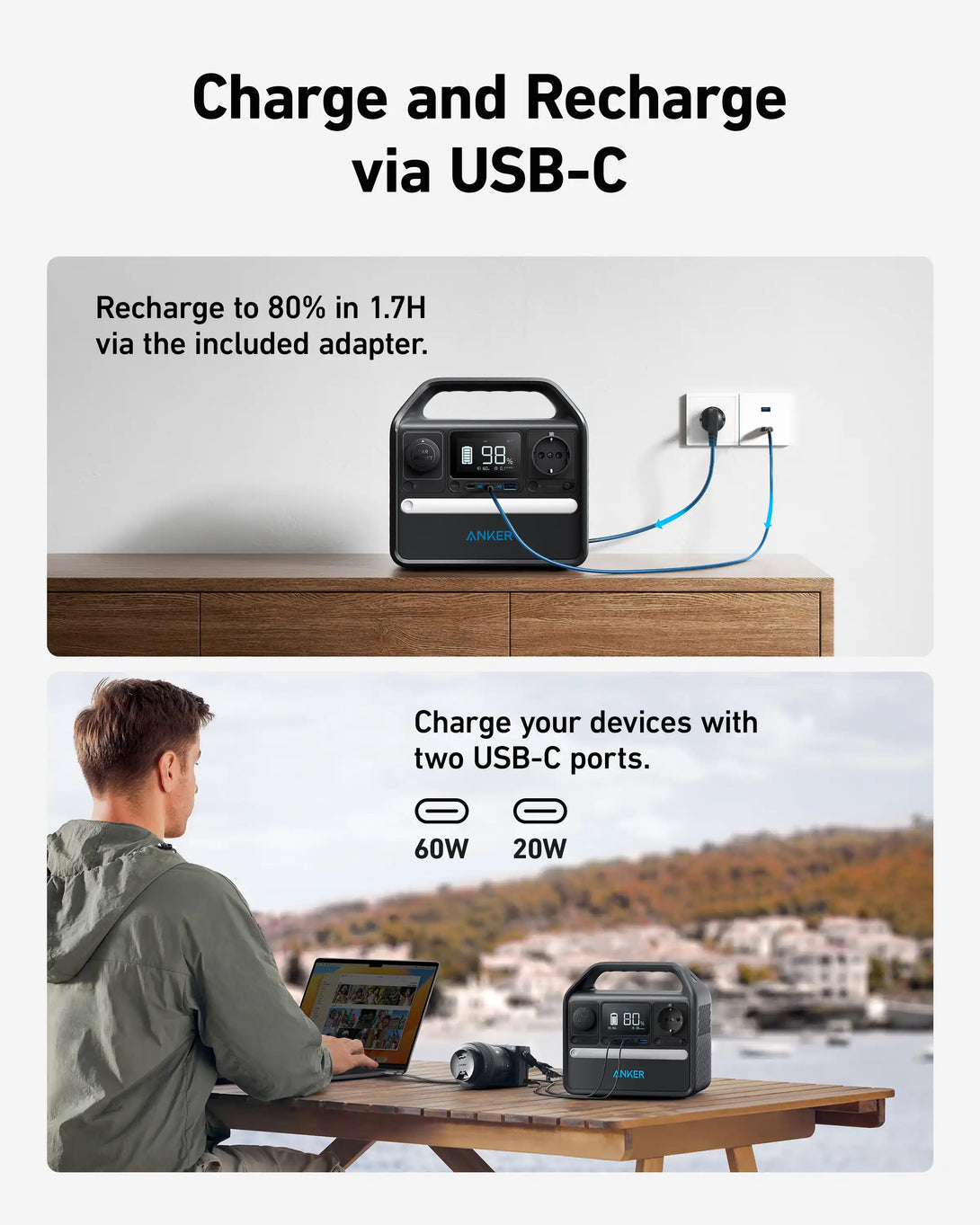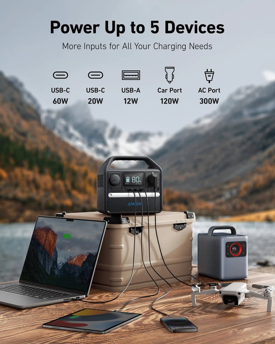 - 5 منافذ لشحن أكثر :تتميز محطة الطاقة المحمولة Anker 522 بمنفذ تيار متردد واحد، ومنفذي USB-C، ومنفذ USB-A، ومنفذ سيارة. يمكنك توصيل ما يصل إلى 6 أجهزة في وقت واحد وشحنها في أي مكان