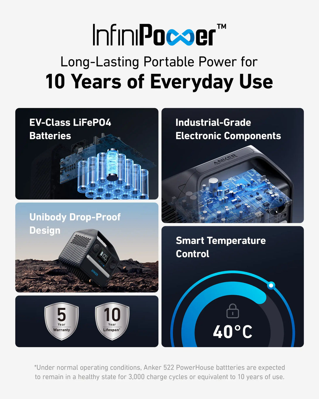 - 10 سنوات من الطاقة طويلة الأمد : تم تصميم محطة الطاقة المحمولة Anker 522 لتدوم طويلاً بفضل تقنية InfiniPower™، التي تتميز ببطاريات LiFePO4 وإلكترونيات فائقة المتانة. بالإضافة إلى ذلك، يراقب نظام التحكم درجات الحرارة حتى 100 مرة في الثانية، كما تم تصميم محطة الطاقة لمقاومة الصدمات.